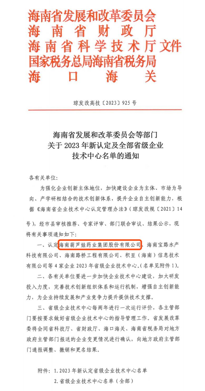近日,海南省发改委等多部门联合公布了《关于2023年新认定及全部省级企业技术中心名单的通知》,其中,海南球速体育药业集团股份有限公司成功通过评审,被认定为省级企业技术中心,是本次获批的4家企业之一。